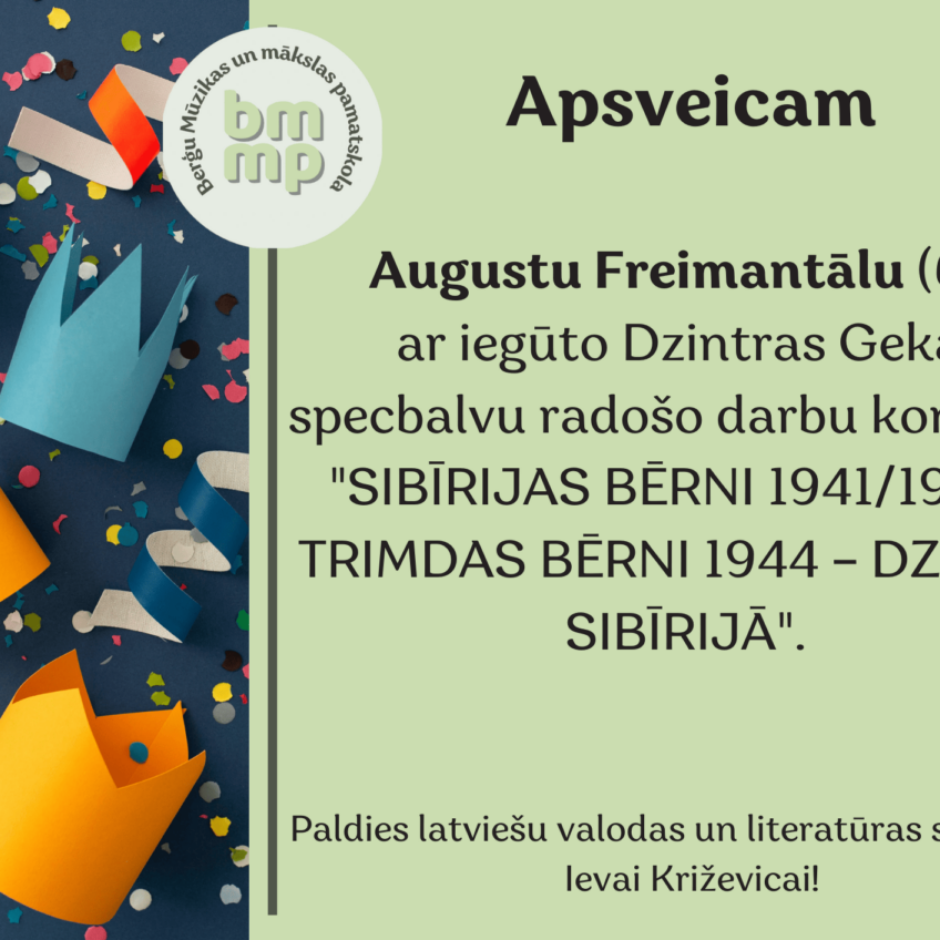 Apsveicam Augustu Freimantālu (6.c kl.) ar iegūto Dzintras Gekas specbalvu radošo darbu konkursā “SIBĪRIJAS BĒRNI 1941/1949 – TRIMDAS BĒRNI 1944 – DZIMUŠI SIBĪRIJĀ”.