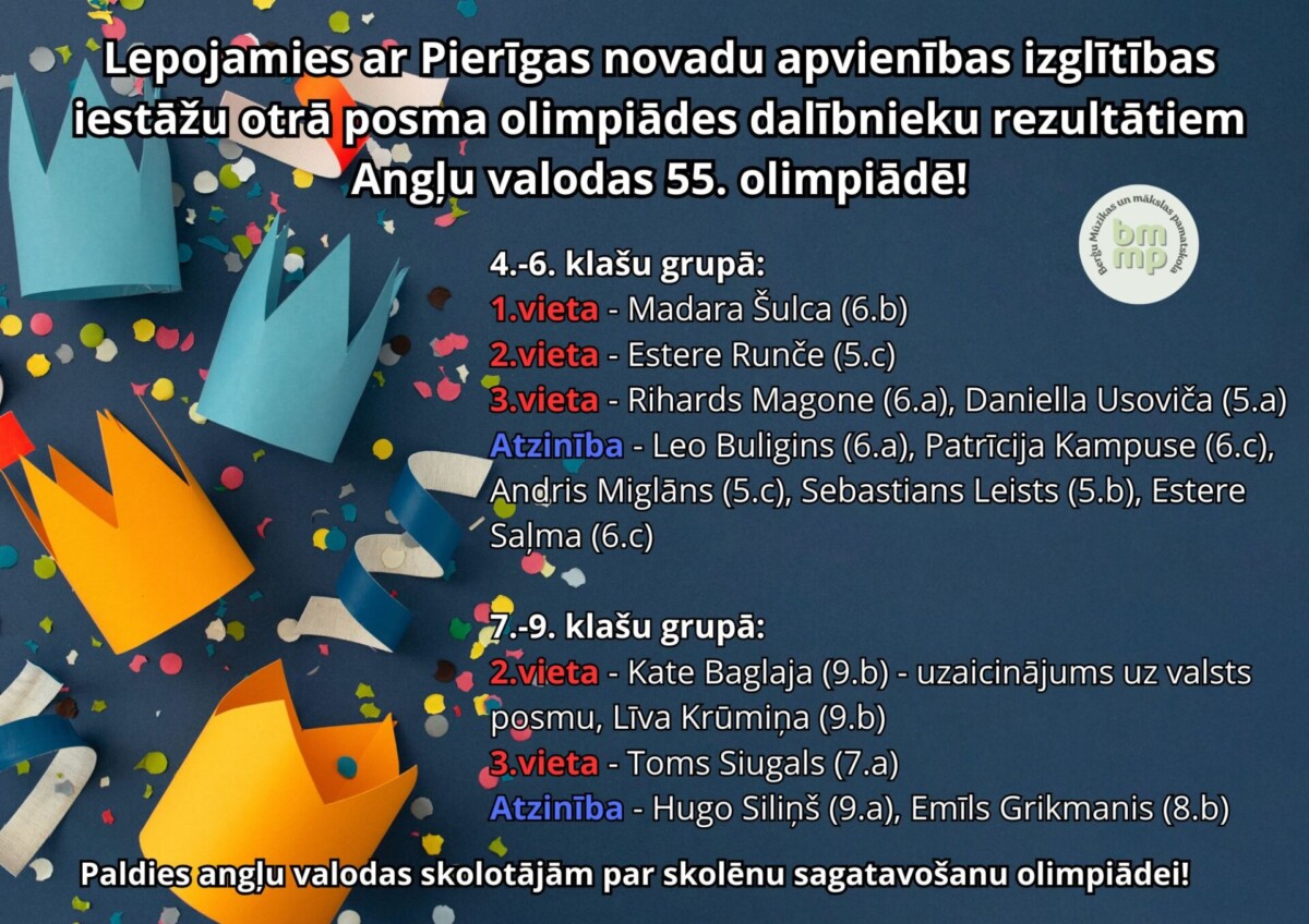 Lepojamies ar Pierīgas novadu apvienības izglītības iestāžu otrā posma olimpiādes dalībnieku rezultātiem Angļu valodas 55. olimpiādē!