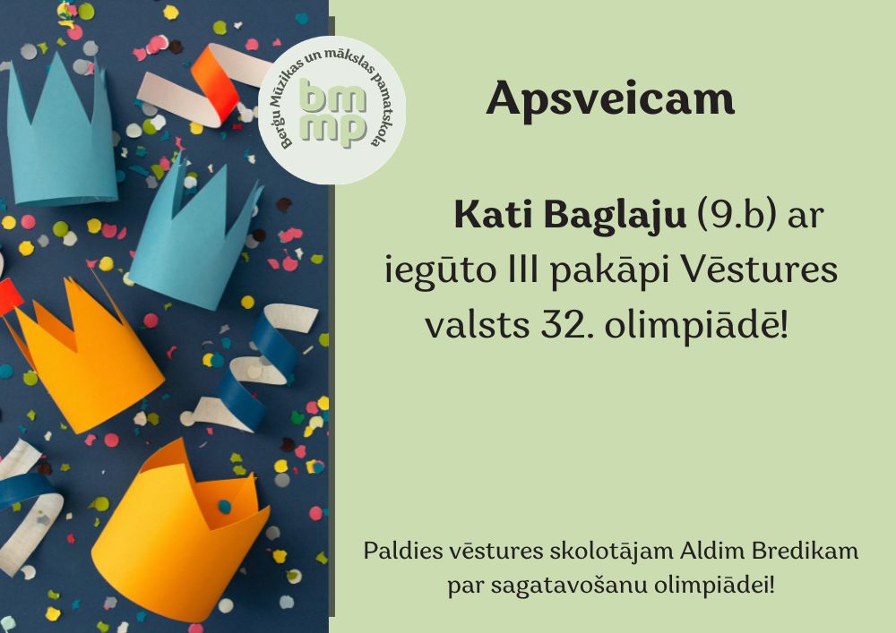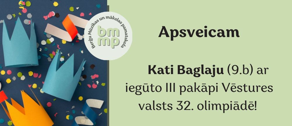 Apsveicam Kati Baglaju (9.b) ar iegūto III pakāpi Vēstures valsts 32. olimpiādē!