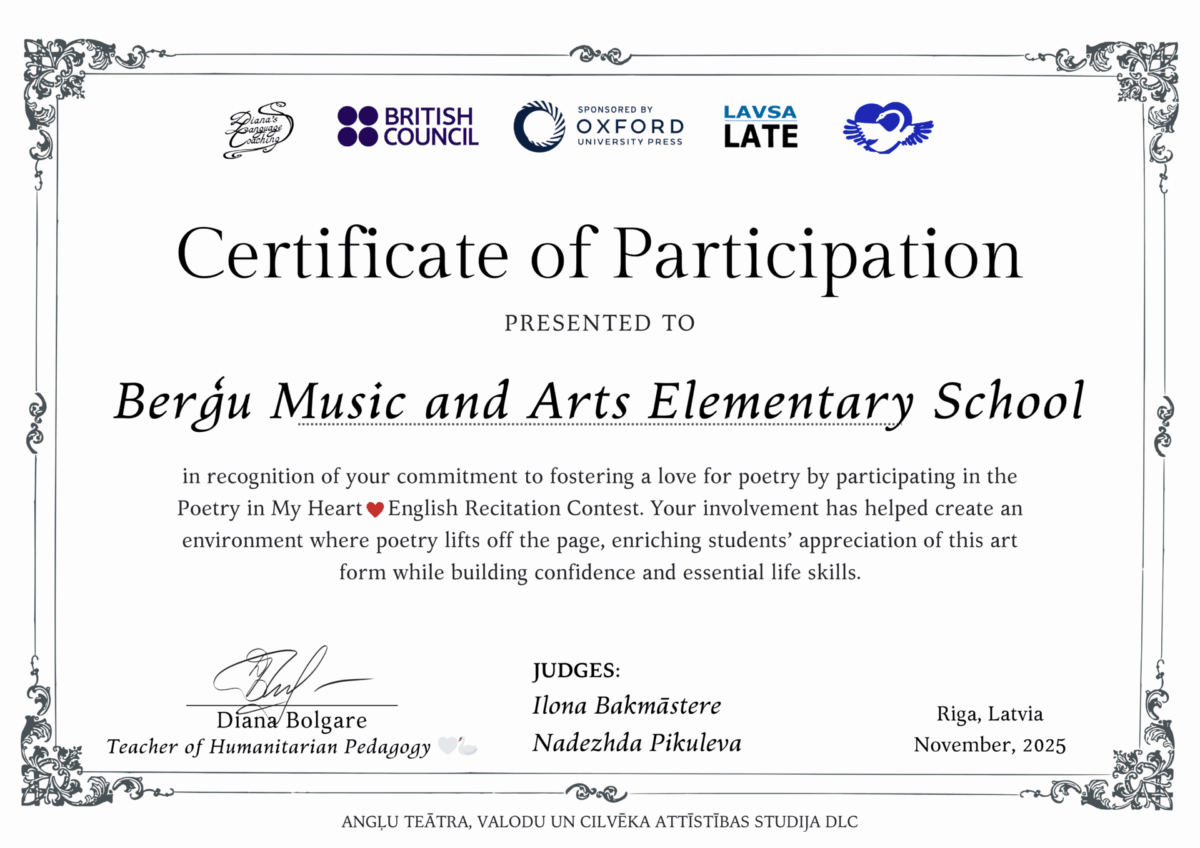 Berģu Mūzikas un mākslas pamatskola ir saņēmusi dalības sertifikātu par piedalīšanos angļu valodas dzejas konkursā “Poetry in My Heart ❤️ 2025”, ko organizē British Council, Oxford University Press un LATE.