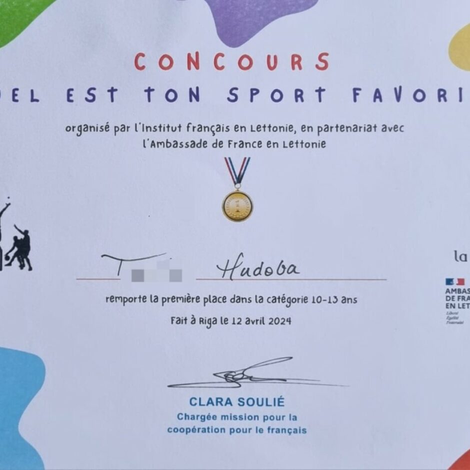 Piektdien, 12.aprīlī notika zīmējumu konkursa “Quel est ton sport favori?”, kuru Frankofonijas mēneša ietvaros organizēja Francijas institūts Latvijā sadarbībā Francijas vēstniecību, balvu pasniegšanas ceremonija. Konkursa uzdevums bija ilustrēt savu mīļāko sporta veidu brīvi izvēlētā tehnikā, un izvērtēšanai tika iesniegti vairāk nekā 170 darbi no visas Latvijas, tostarp arī no Berģu Mūzikas un mākslas pamatskolas.