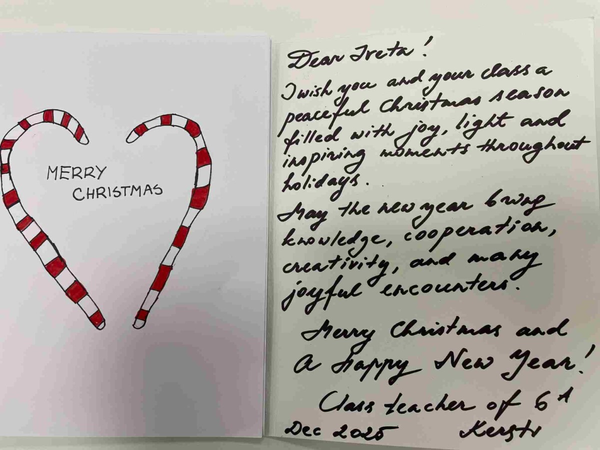 Paldies, 6.a kl. skolēni un kl.audzinātāja Kersti Koppel, par sirsnīgiem Ziemassvētku apsveikumiem un pārsteigumu paciņā, ko 6.a klases skolēni pat ļoti novērtēja tējas stundā!