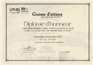 Saņemts diploms no Francijas, kur Veronika Kuzņecova /sk. Maija Purgaile/ veiksmīgi piedalījās Starptautiskajā mākslas konkursā, kura šī gada tēma veltīta mākslai un kultūrai kā ceļam uz mieru pasaulē.